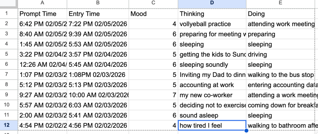 I found it interesting to sample these moments at random and keep a log. I came up with a useful 0-10 mood scale. And, after 30 days of twice-daily random prompts, I looked at the data on a spreadsheet and gained some insight into my mood and the bigger picture. I was interested in my average mood over time, and how different activities, thoughts, and times of day were linked to mood fluctuations.